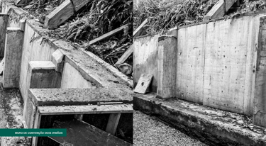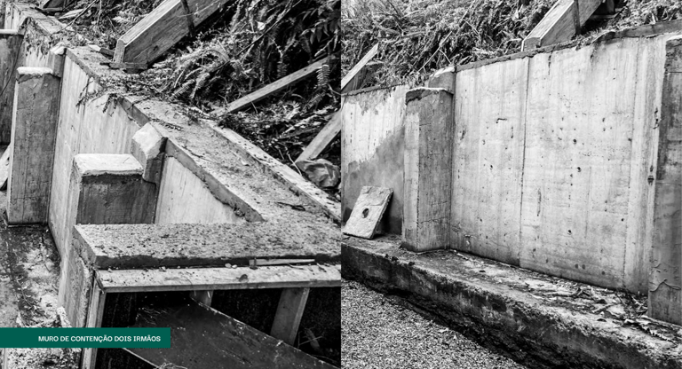 Execução de muro de contenção. Preparação e limpeza da encosta, execução de fundação profunda, preparação de formas e ferragens conforme projetos estrutural, concretagem de 148 m³ de concreto, ajuste do talude e plantio de grama.