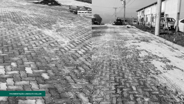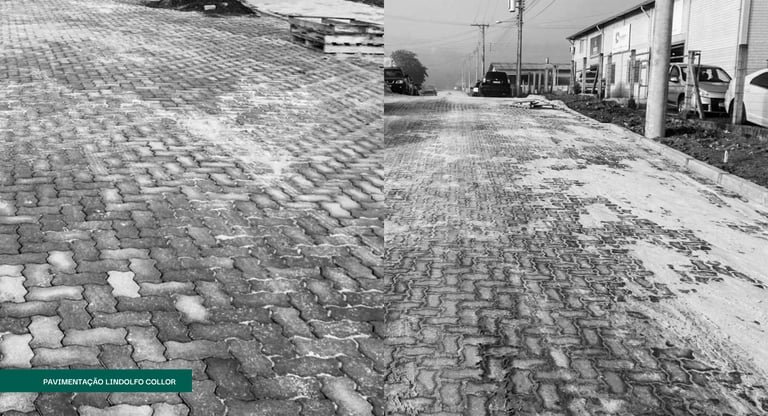 Execução de pavimentação em blocos intertravados em Lindolfo Collor. Preparação do subleito, execução de base com brita graduada e instalação de blocos de concreto.