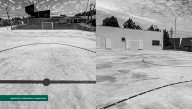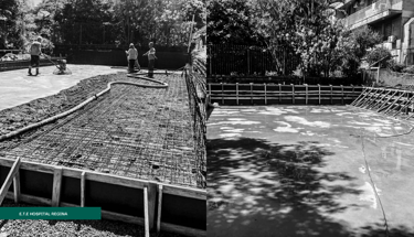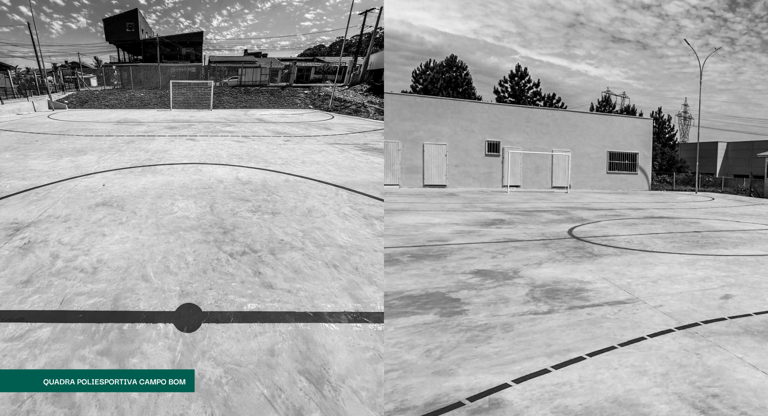 Execução de quadra poliesportiva de concreto. Preparação do terreno, execução de fundação, vigas, piso de concreto, vestiários e cozinha em alvenaria, cercamento e passeio púbico com rampa de acessibilidade.